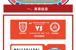 4月17日周五19:35,中超第6轮,重庆铜梁龙主场对阵深圳新鹏城的比赛在铜梁龙体育场进行,俱乐部官方发布本场票务信息,票价分为90元、120元、150元、200元以及300元5档,开售时间为4月14日19点。
